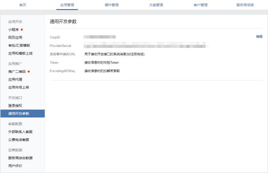 第三步,在创建应用前,我们需要配置微信开发信息,具体位置在管理后台的通用开发参数进行编辑。