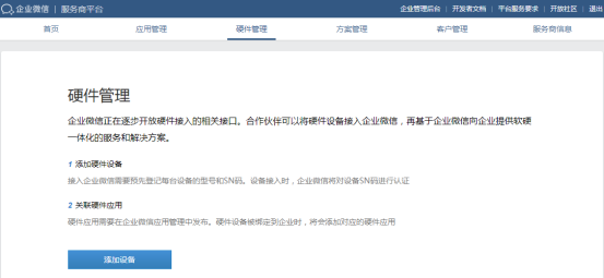 企业微信第三方应用的创建需要有一定的微信开发能力,具体参数和信息配置步骤可以参考企业微信服务商官网连接办公硬件的接入指引。