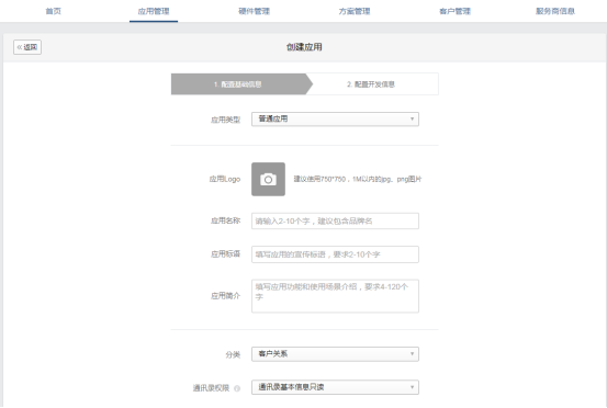 第四步,创建应用,依次填写配置信息,信息后续可以再次修改,不知道怎么填可以先随便填一个,应用上线前服务商必须认证。