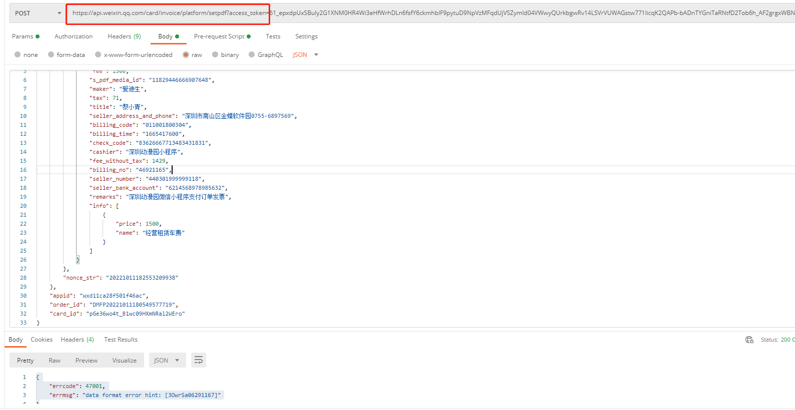 } 使用文档下示例进行发送统样报47001,代码执行,postman执行都是报47001