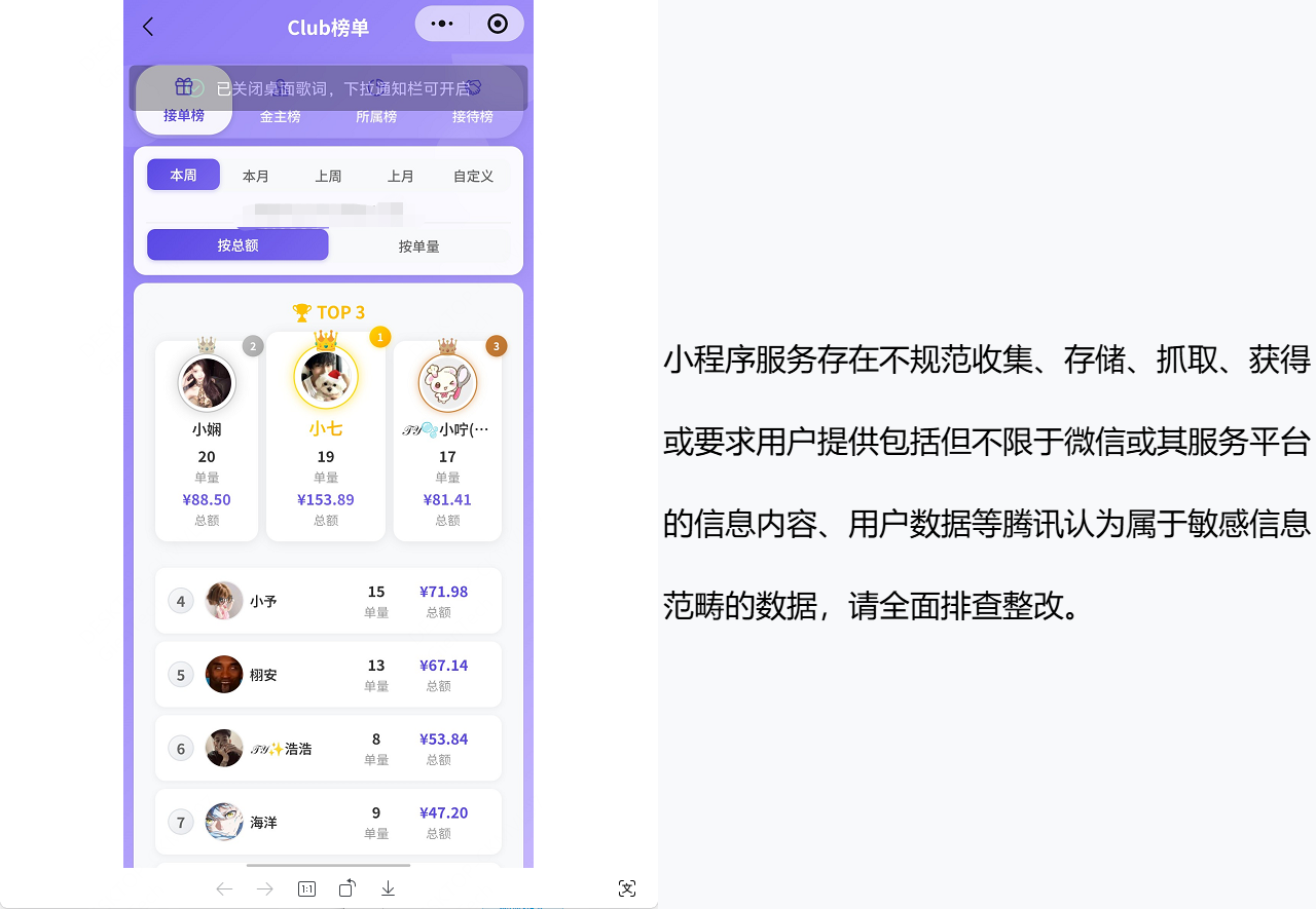求告知这种违规,我改怎么处理,删除榜单功能还是这个页面的内容需要调整呢?麻烦告知下,不知道具体说的什么呀,没有违规收集用户信息呀!