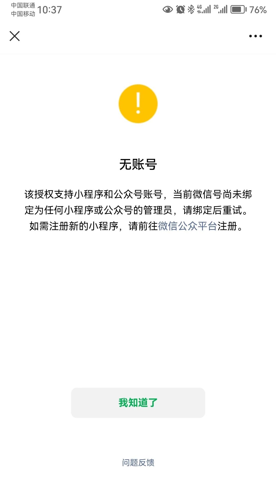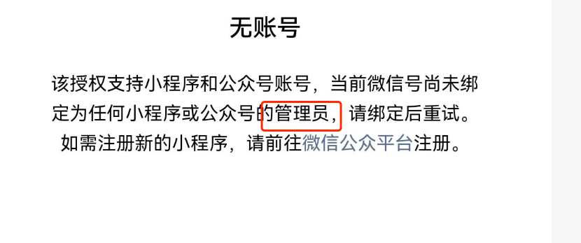 进行公众平台账号授权操作时,管理员微信扫描后, 提示无账号(图1)。实际为微信公众号管理员(图2),请协助处理或尽快反馈处理