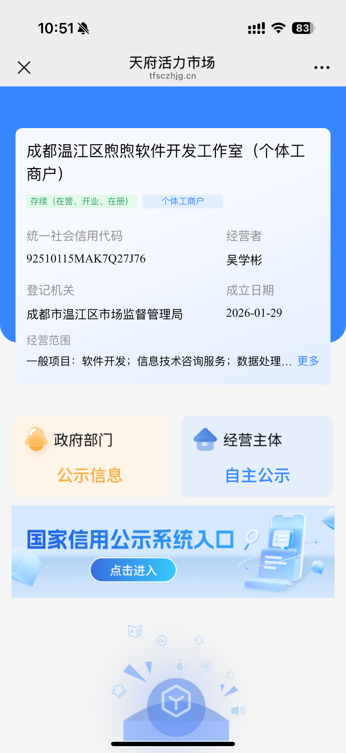 这个小程序是个体户主体成都温江区煦煦软件开发工作室(个体工商户),刚刚通过备案和小程序微信认证,