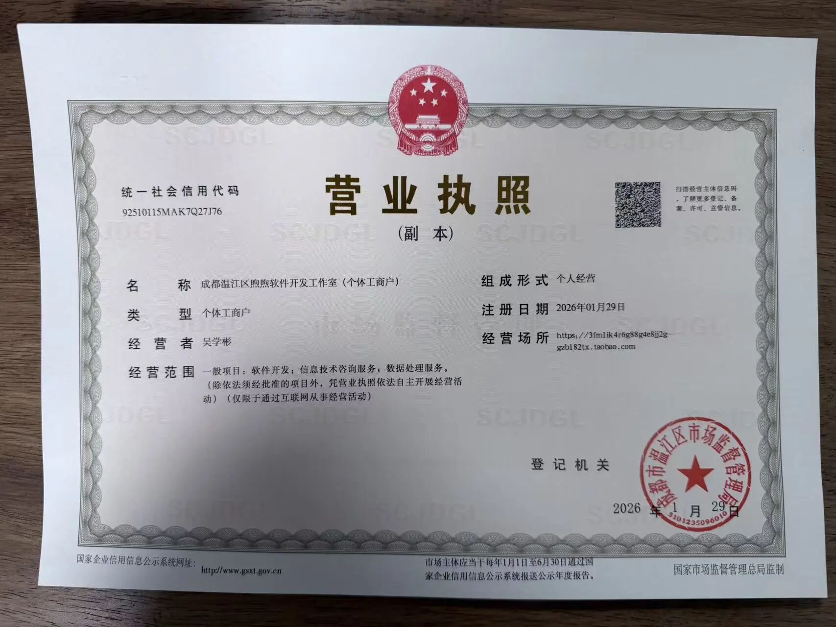 营业执照见附件,注册日期是2026年01月29日,通过扫描营业执照上的二维码可以看到主体是在“存续”状态,