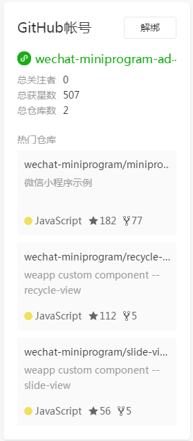 为了使大家与 GitHub 的成绩相关联,大家可在自己的个人/企业主页绑定 GitHub 的帐号,我们会在主页展示你的 GitHub 关注人数、总仓库数、总获星数和热门仓库。