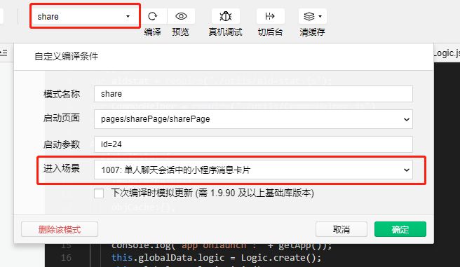分享的测试我都是用场景值,然后编译之后点真机调试,二维码扫出来就可以调试这个模拟分享的了。