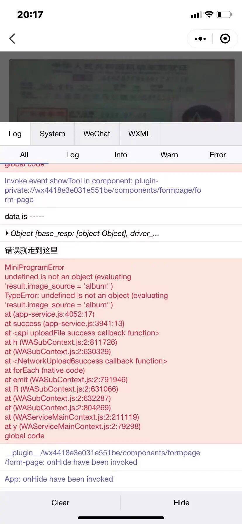 我昨天也遇到这个问题。这个不是自己代码的问题。是微信ocr那里就出错了。我昨天晚上就看到了,调试了一把,有结果返回,但是err标志却是true。不过今天他们已经悄悄的修复了。还有一个问题,驾驶证的驾驶证号,id_num 字段不返回了。真是无语了。