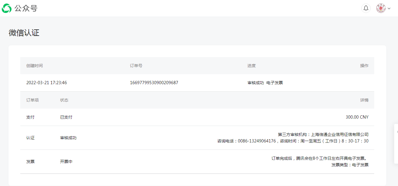 【页面链接】: https://mp.weixin.qq.com/acct/wxverifyorder?action=order_list&token=868647096&lang=zh_CN