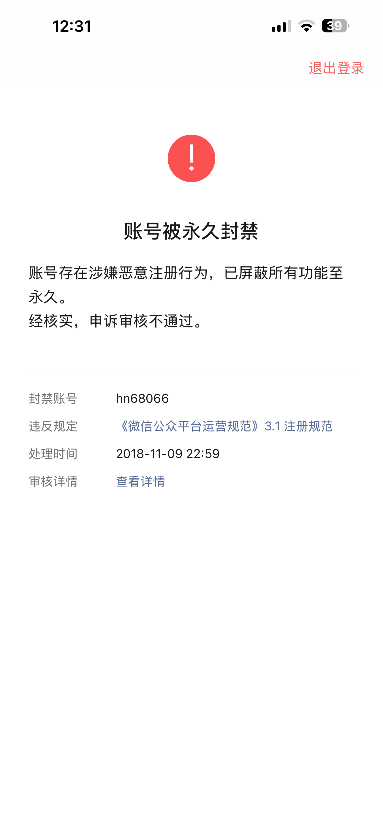 我想注册公众号 注册时显示账号被永久封禁 封禁时间是2018年11月份 我的印象我没用过公众号
