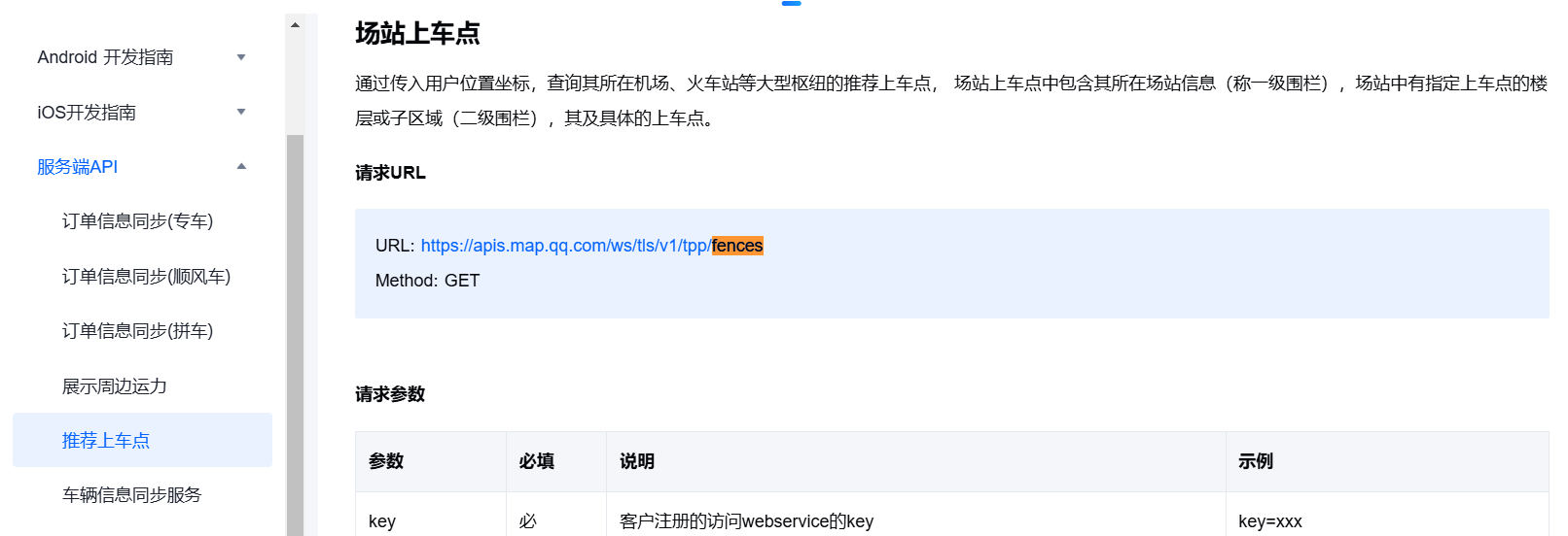 微信小程序组件里面有一个地图Demo,里面有一个推荐上车点,获取当前位置然后判断是否命中一级围栏,其中https://apis.map.qq.com/ws/tls/v1/tpp/fences官方文档并没有找到这个接口,求求大家了,有谁用过啊?