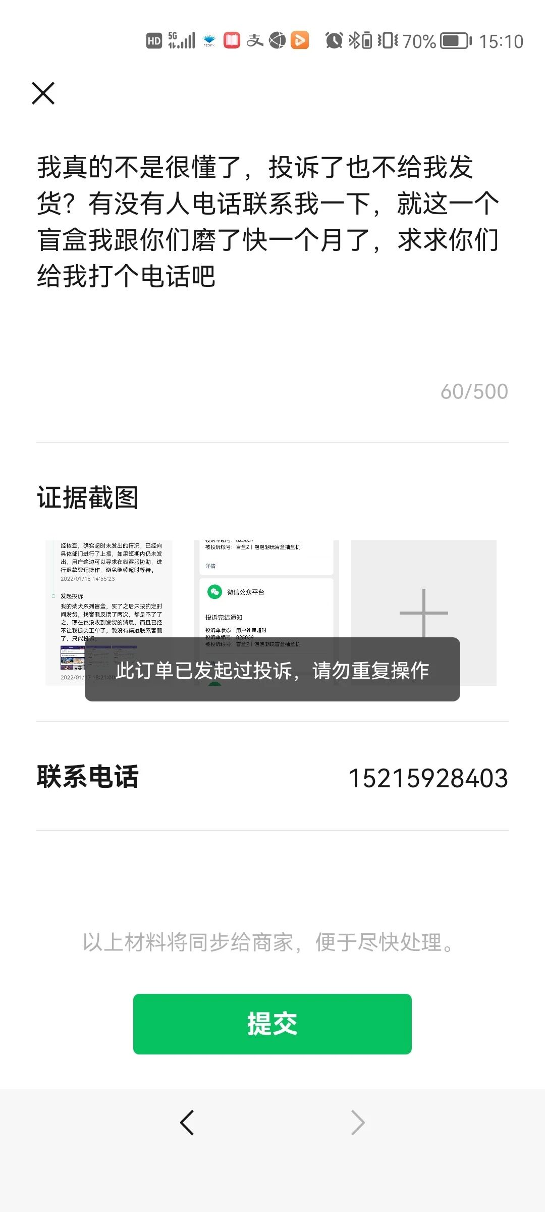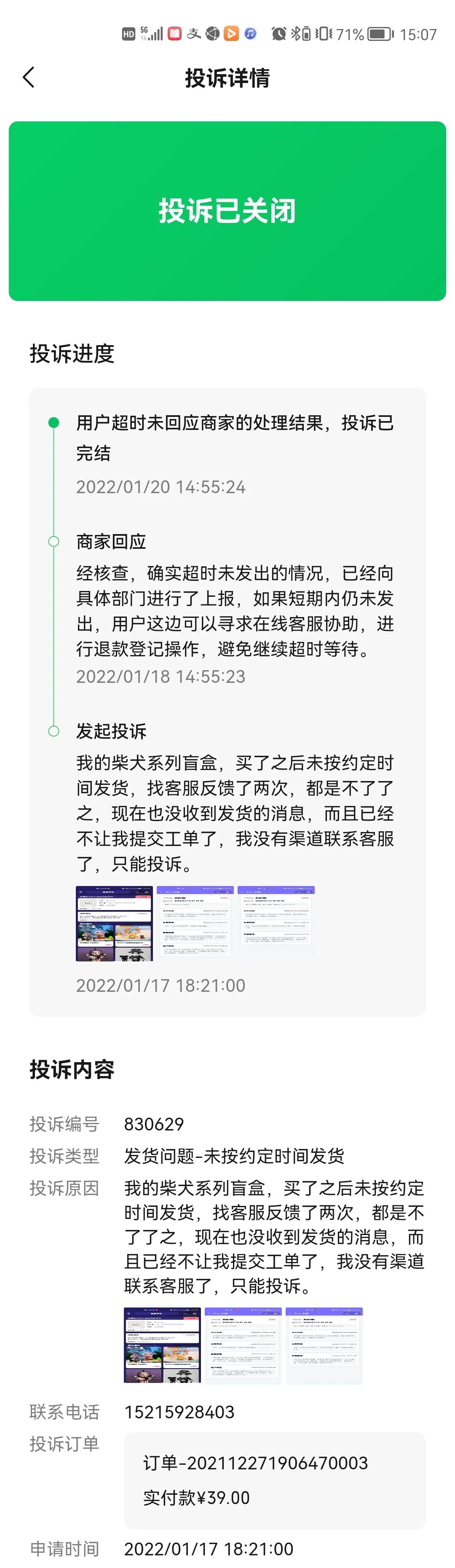 收货地址及手机号建议打码,注意保护个人隐私,看你之前的投诉是没及时回复商家的处理结果,建议找商家的在线客服联系解决问题.