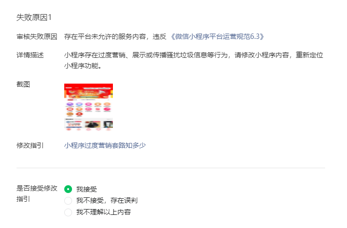 小程序存在过度营销、展示或传播骚扰垃圾信息等行为,请修改小程序内容,重新定位小程序功能