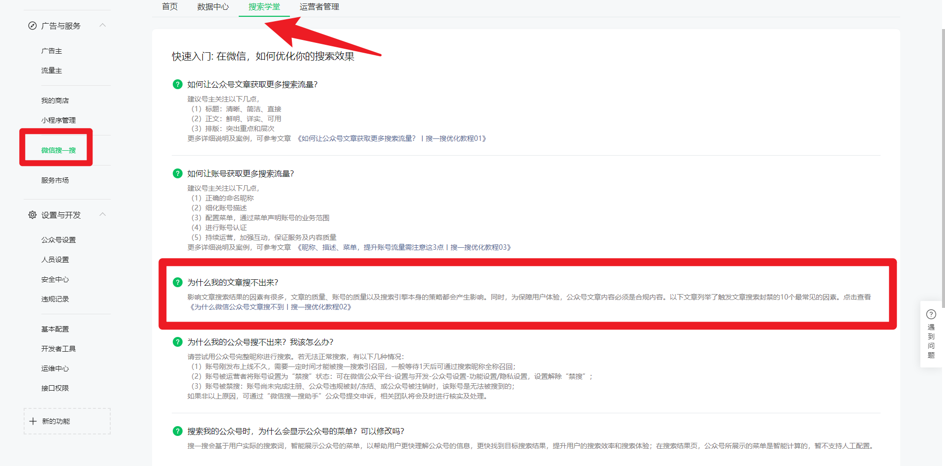 你好,搜一搜搜索不出来的话,建议参考一下:公众号后台——微信搜一搜——搜索学堂