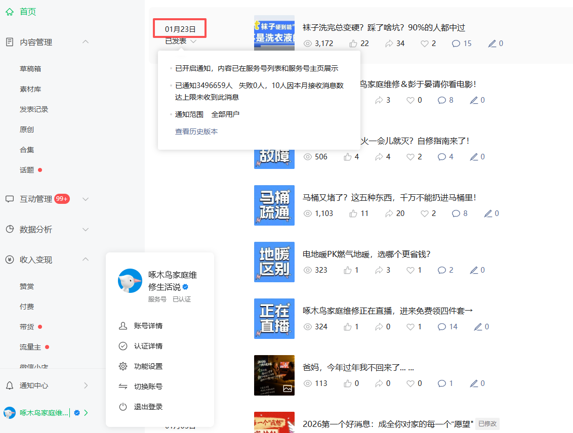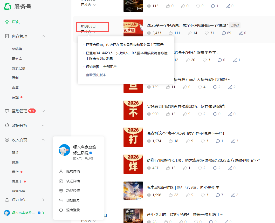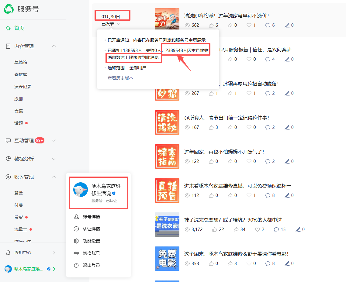 该账号在微信公众后台,于01.01、01.03、01.23 群发3次(如上图);