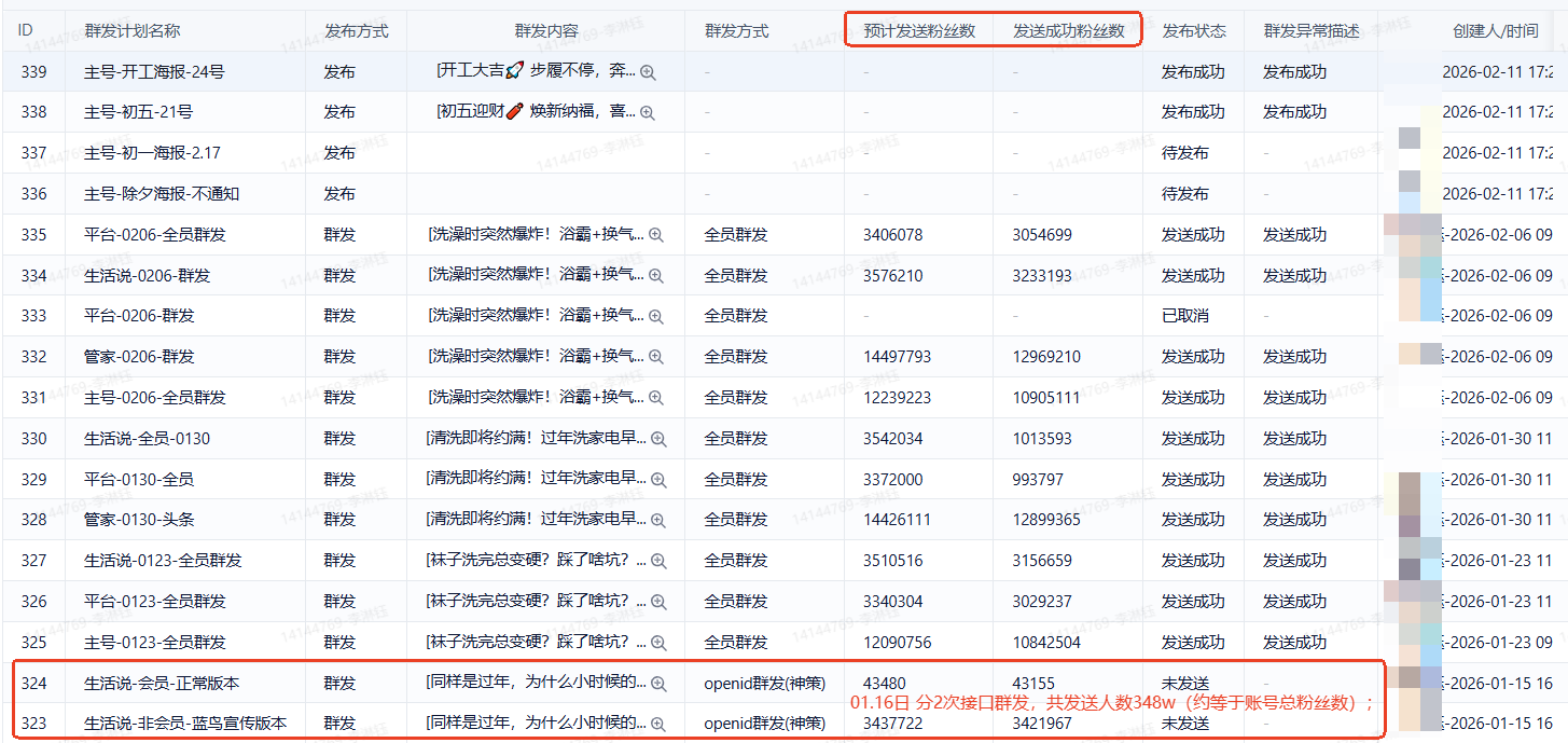 该账号使用三方平台,通过接口于01.16 群发1次(如上图 针对人群 约等于 账号全部用户);