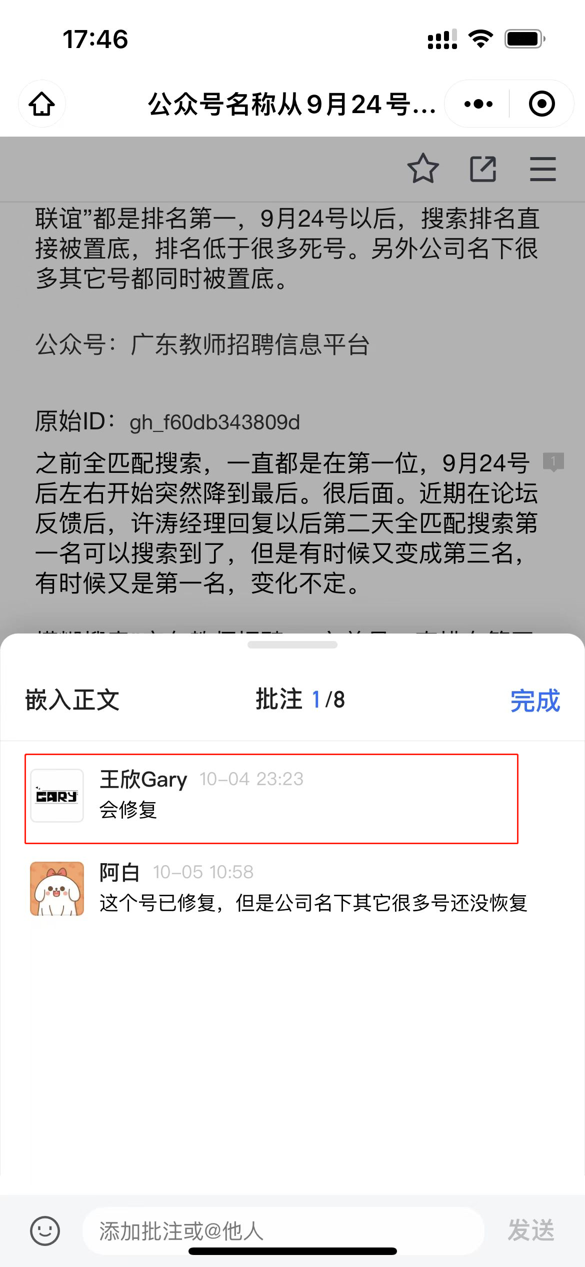 公司主体下的全部公众号突然模糊搜索都降到最底部了,导致现在公司损失惨重,之前都是在第一第二的。没有任何违规行为,公众号后台也没有消息提示。