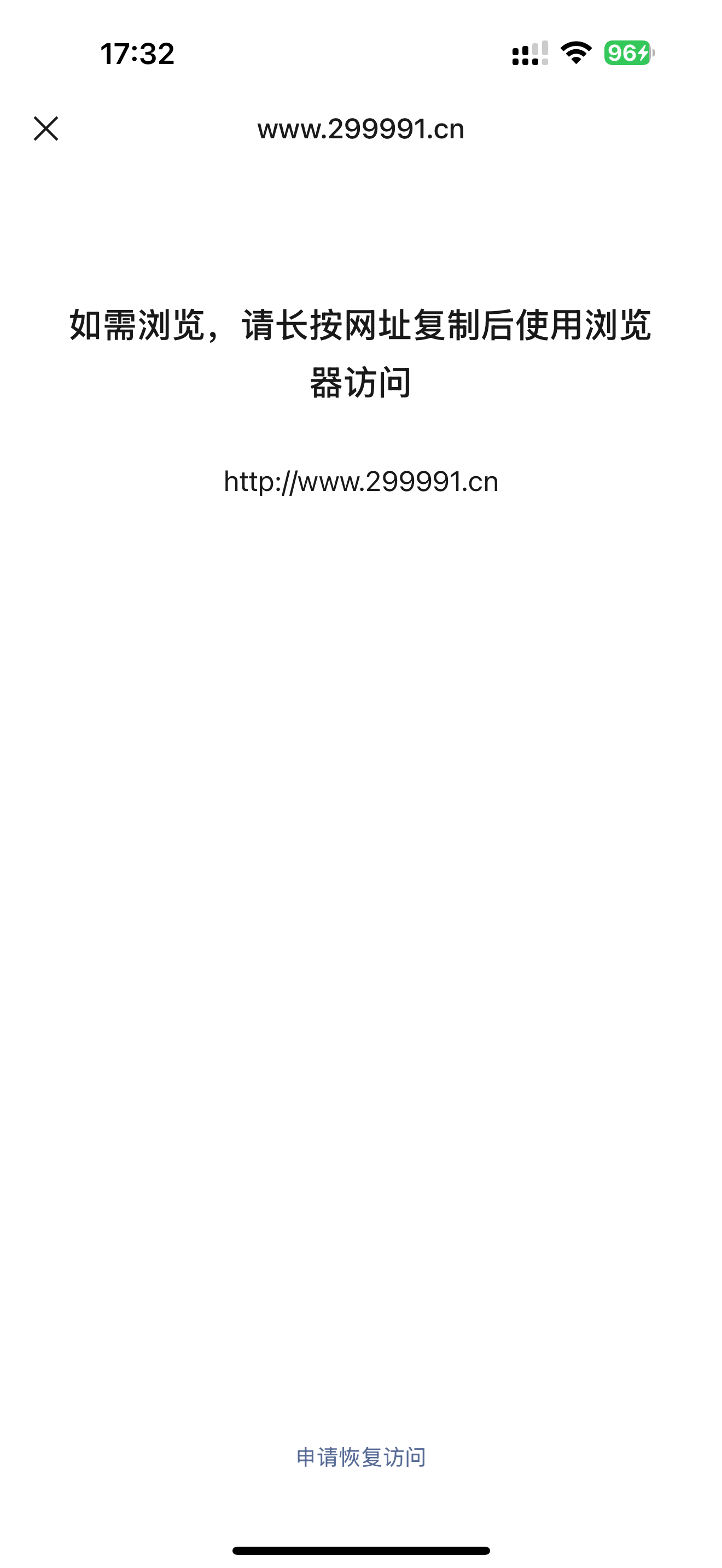 在微信里面访问我们网站:www.299991.cn 一直提示”如需浏览,请长按网址复制后使用浏览器访问“,麻烦帮忙解决一下,相关信息如下: