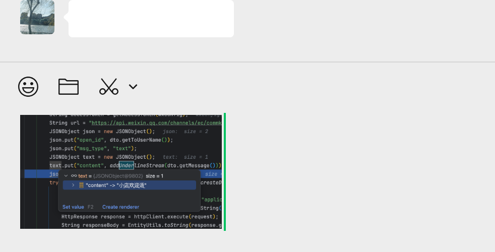 代码是上面的,这个代码在小程序和公众号是可用的,在微信小店回复就是显示回答了个空白,如下图的空白回复