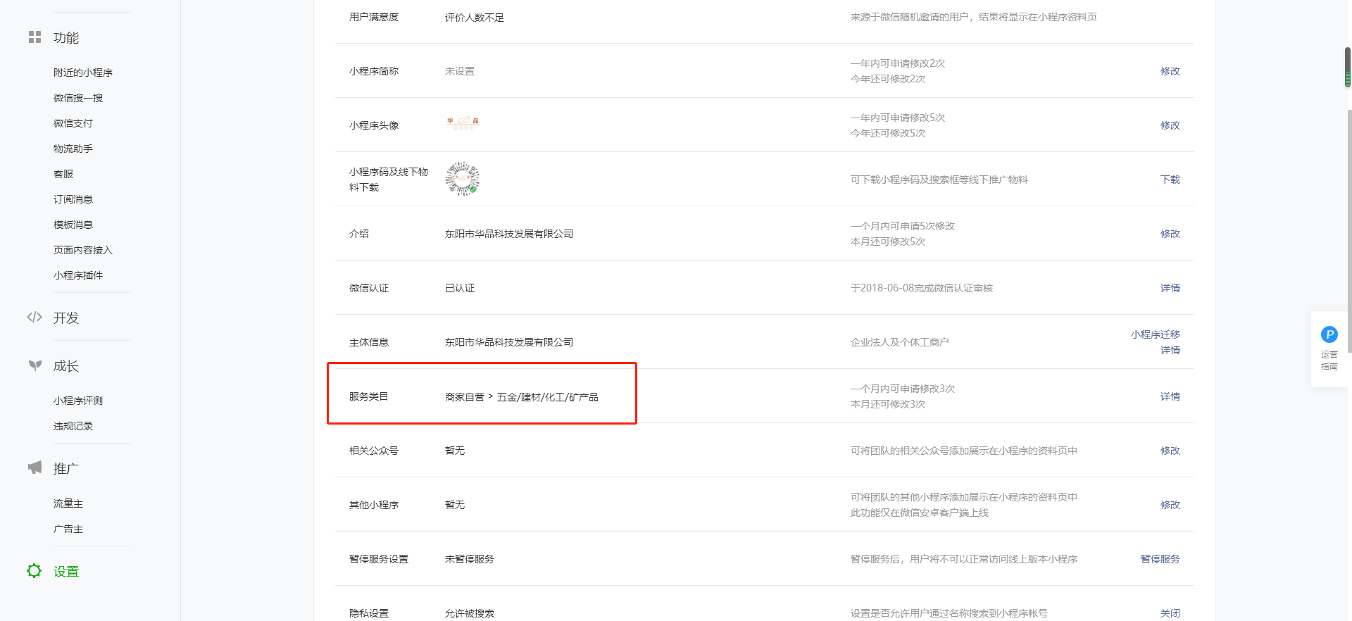小程序搜索时下方类目显示错误,小程序后台类目为“商家自营 > 五金/建材/化工/矿产品 ”,但是在微信-发现-小程序搜索显示的类目为“保健品”,显示错误。