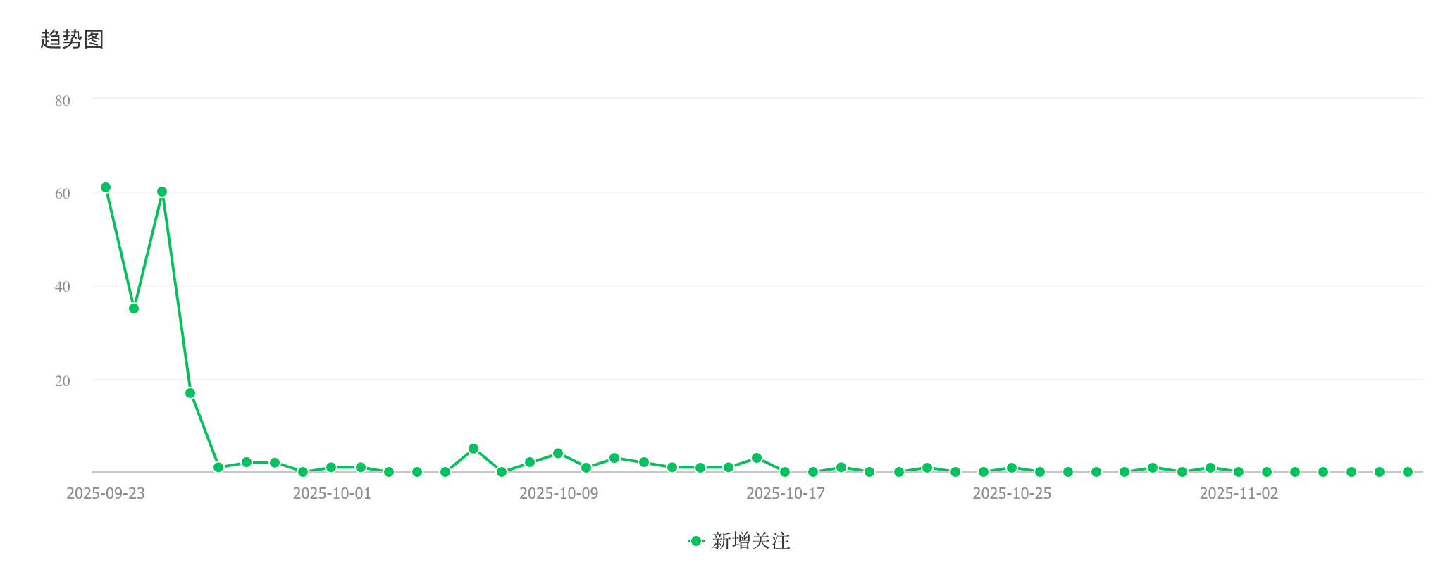 - 从 9月26日开始,新增关注人数骤降至 0–2 人,此前三周日均新增约 40–60 人。