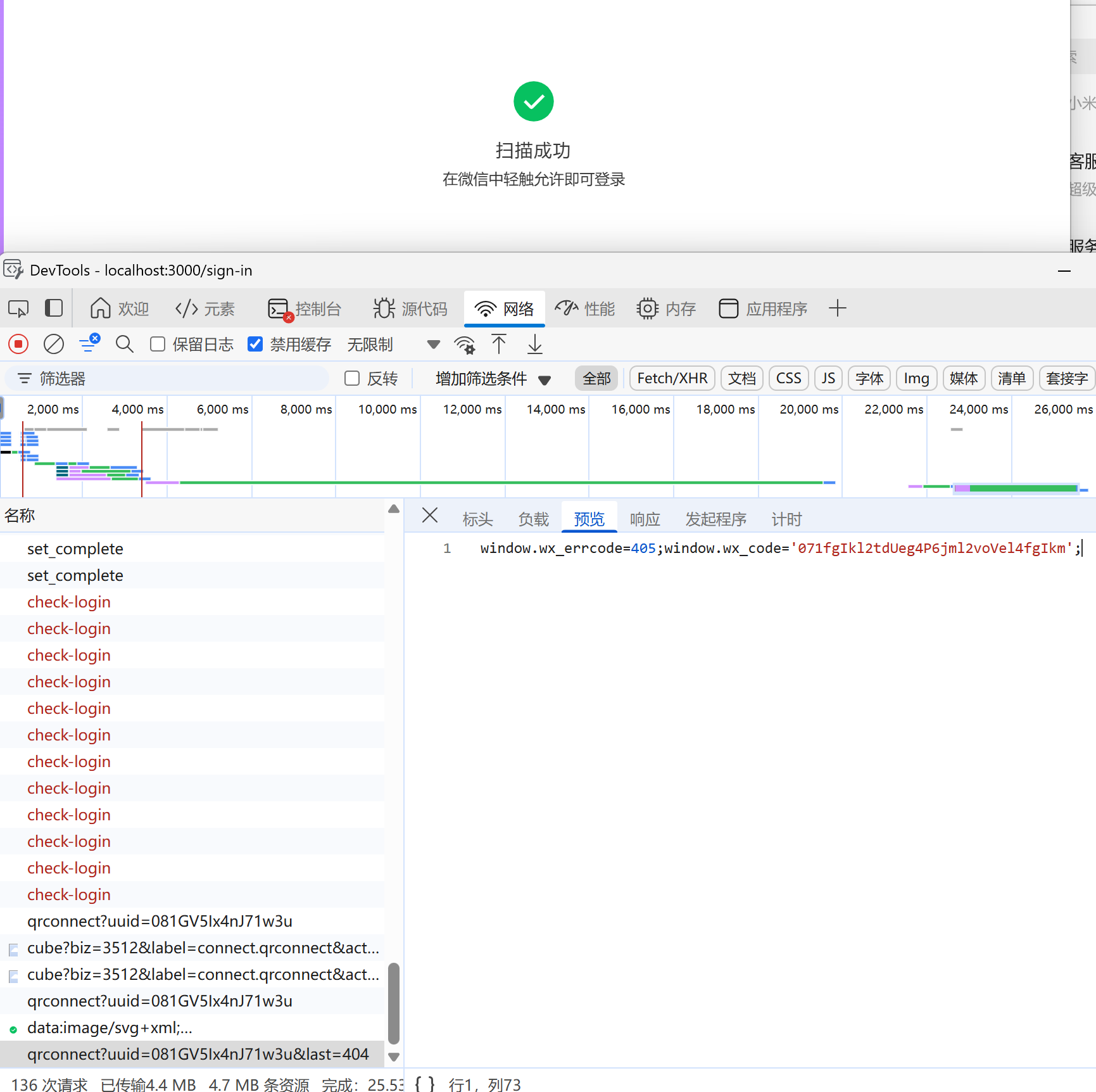 然后使用微信扫码,点击授权后,可以看到 api 返回了 wx_code,但是页面没有发生跳转,一直卡着不动了
