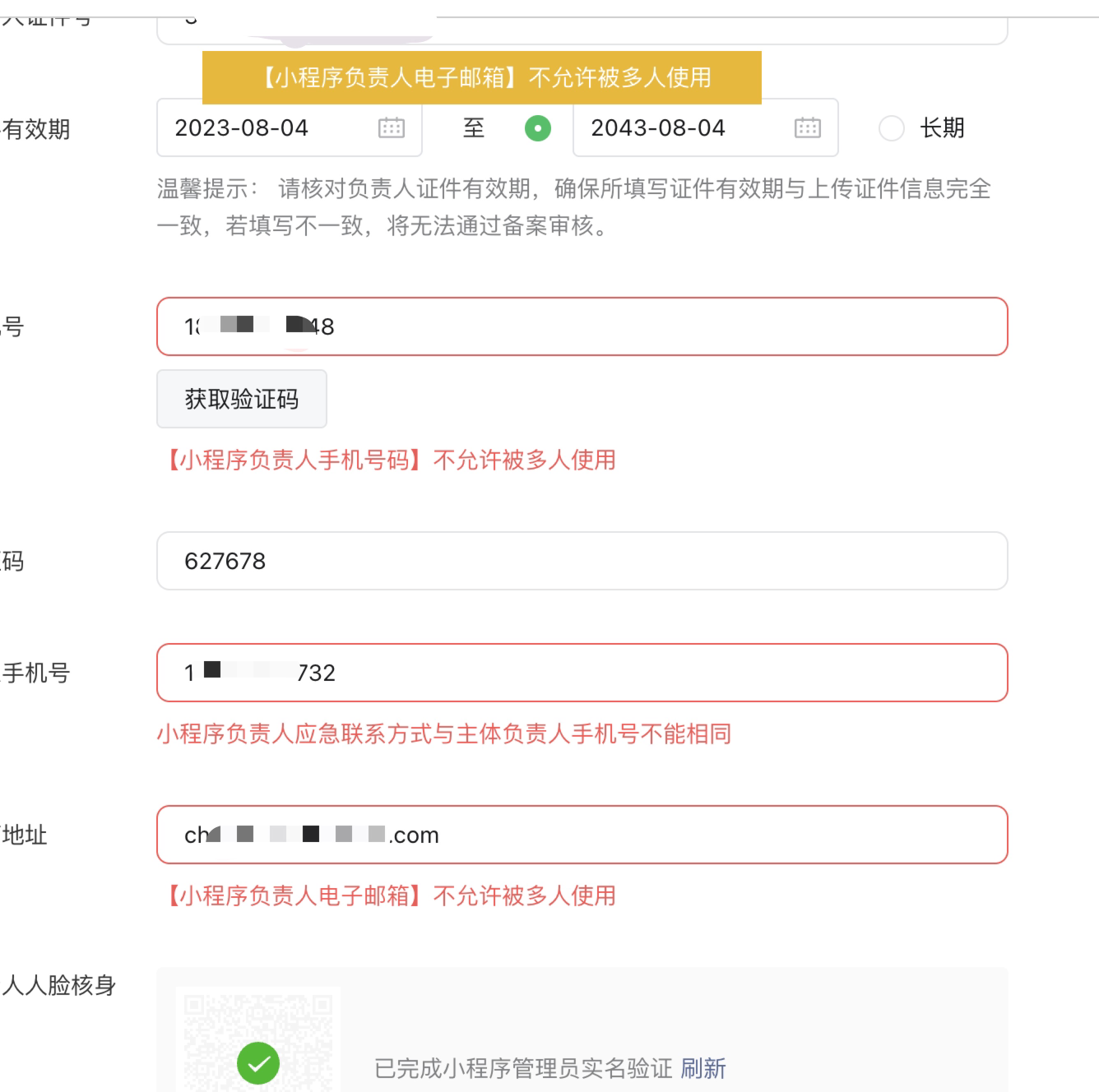 在平台备案系统中,人,手机号,应急手机号,邮箱均一一绑定,同一个人允许为多个小程序备案(同一主体下),可以提交一致的手机号、应急手机号及邮箱,但不能出现不同人共用手机号/邮箱的情况。