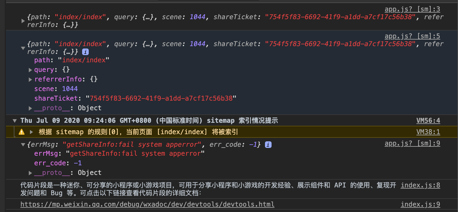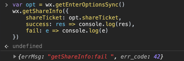 var opt = wx.getEnterOptionsSync() wx.getShareInfo({ shareTicket: opt.shareTicket, success: res => console.log(res), fail: e => console.log(e) })