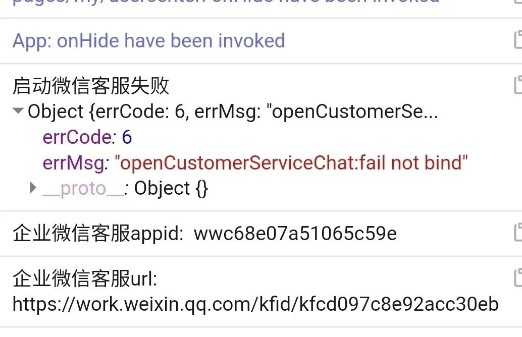 wx.openCustomerServiceChat({ extInfo: { url: tourl }, corpId: app.globalData.initdata.corpid, success(res) { console.log('启动微信客服成功',res) }, fail(err) { console.log('启动微信客服失败',err) console.log("企业微信客服appid:" ,app.globalData.initdata.corpid) console.log("企业微信客服url:" ,tourl) wx.showModal({ content: JSON.stringify(err), cancelColor: 'cancelColor', }) } }); 这个是我代码