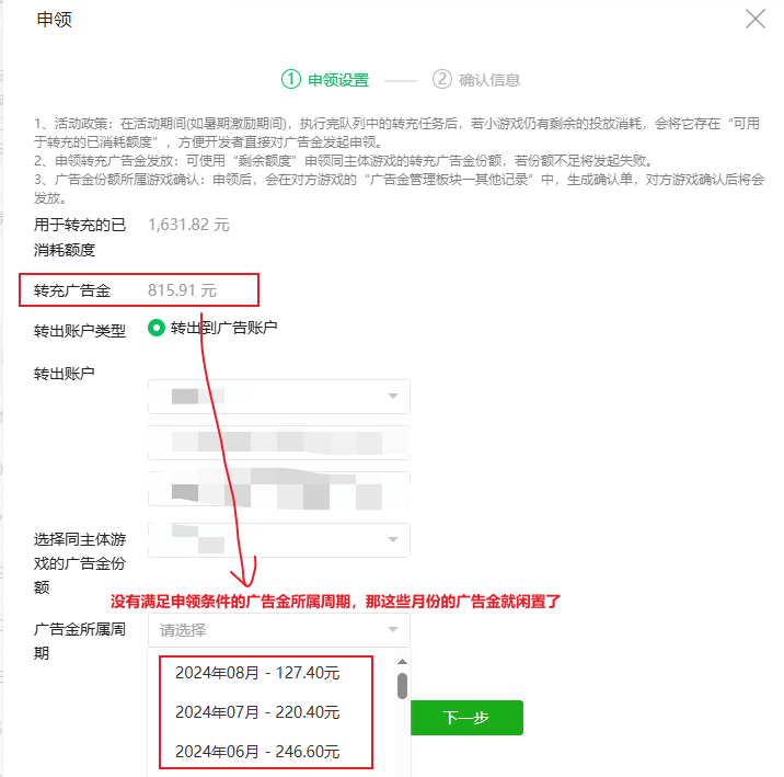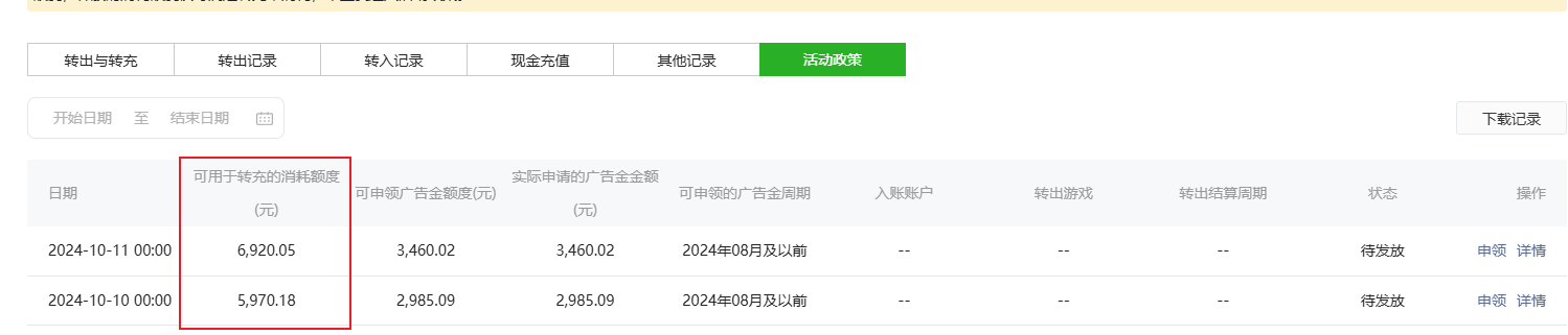 问题一:如图,【可用于转充的消耗额度】是如何计算出来的,跟什么挂钩呢?因为如果不知道这个消耗额度的计算方法,那较难控制投放侧的投放金额,也就无法100%领取激励金使用。例如广告激励金额度只有4000,但是每笔【可用于转充的消耗额度】都是大于10000的(5000*2),可申请的广告金金额大于5000,那就一直都没办法申领到4000这笔广告金了,因为广告金可用余额不足申领的金额,无法发放。目前有较多账号存在这种问题的,申领的金额都大于广告金剩余额度,而导致广告金闲置或过期无法使用。