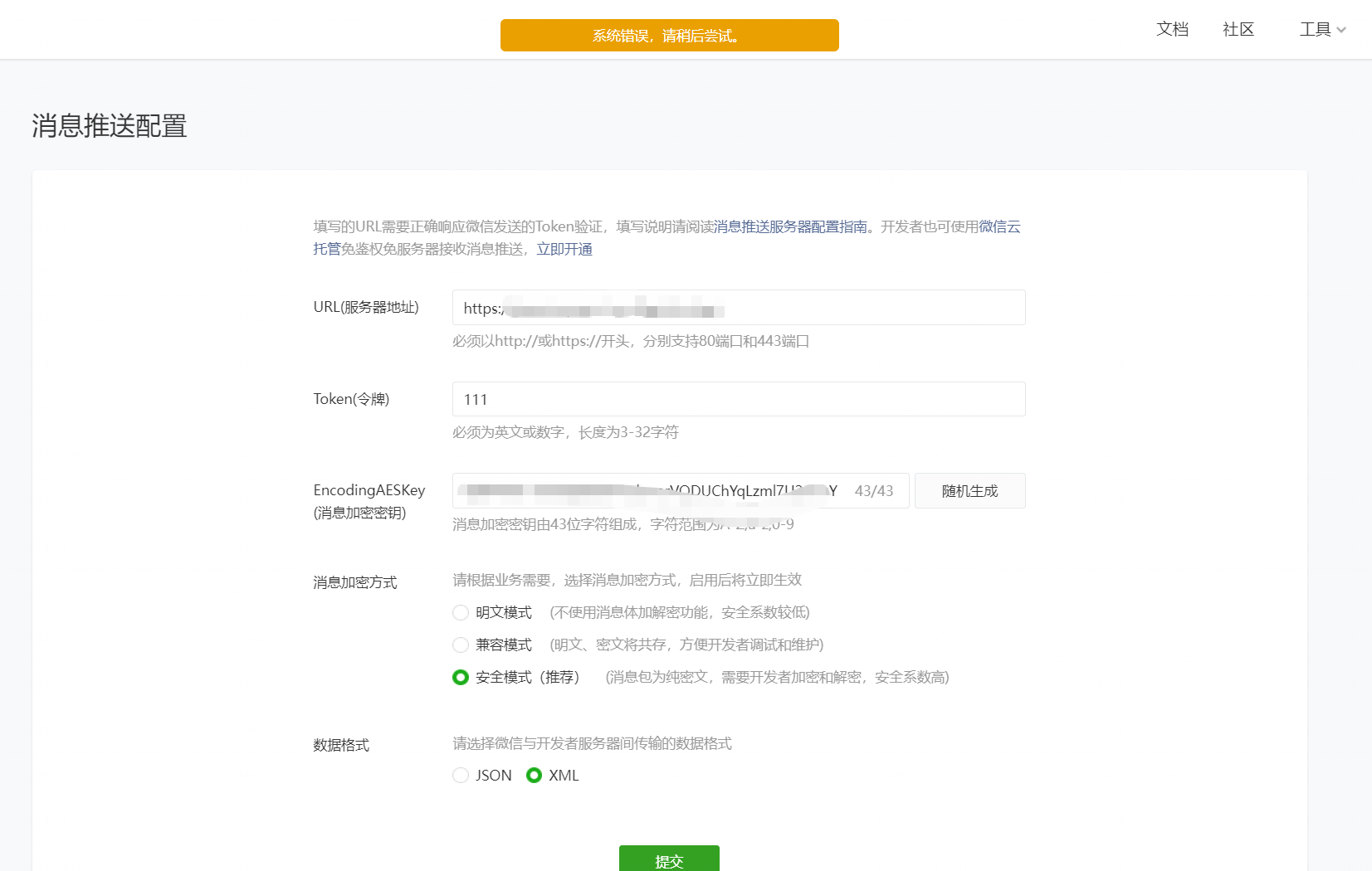 你好,开发者调试可以用官方工具试试: https://developers.weixin.qq.com/apiExplorer?type=messagePush