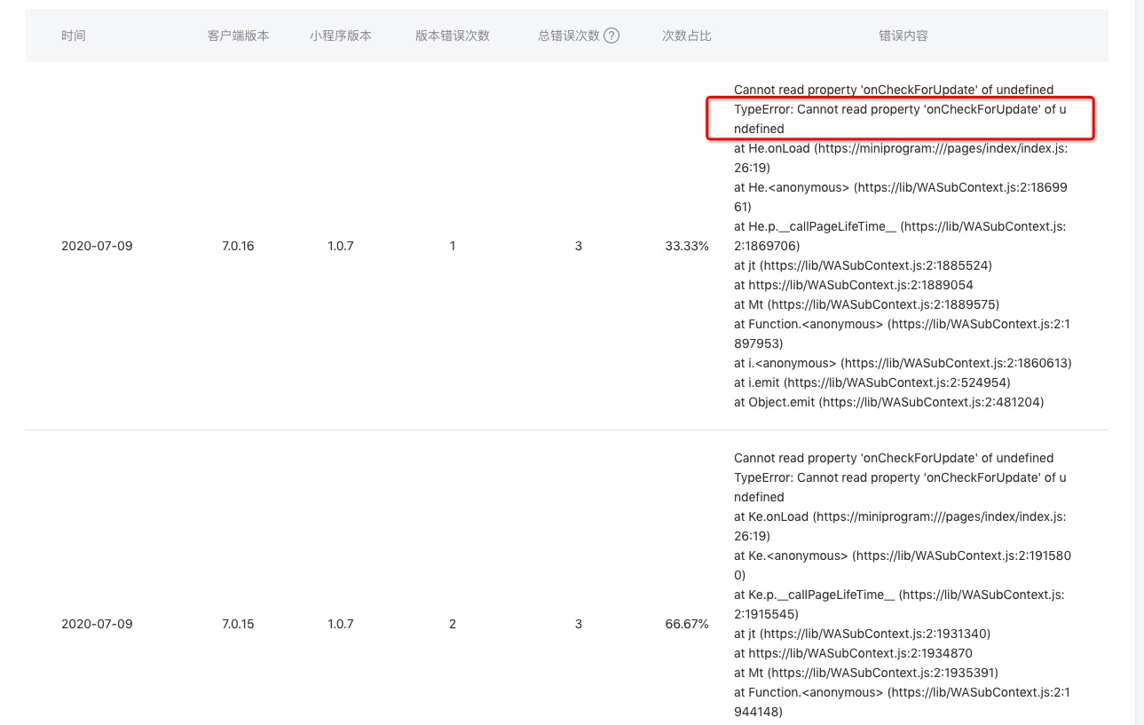 let startParamObj = wx.getLaunchOptionsSync(); // 检查是否存在新版本. // 获取小程序更新机制兼容 // // 单页面模式情况下,不检查更新. if (wx.canIUse('getUpdateManager') && startParamObj.scene!=1154) { const updateManager = wx.getUpdateManager() if(updateManager.onCheckForUpdate){ // .... 省略 } }请问解决了吗?我的也出现这个问题了
