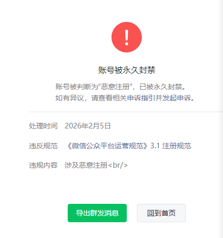 服务号刚申请下来,就内部发布了测试,功能都在小程序上,现在服务号提示“恶意注册”,已被永久封禁。