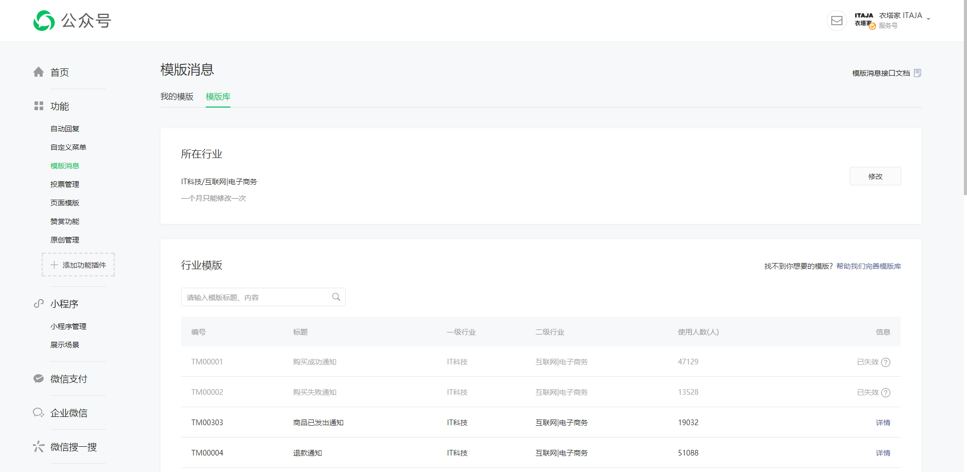 申请模板消息时选择了主营行业为IT科技-互联网/电子商务,副营行业为IT科技-IT软件与服务,但是审核通过后只显示了主营行业,没有副营行业,影响到消息推送,要怎么解决呢?