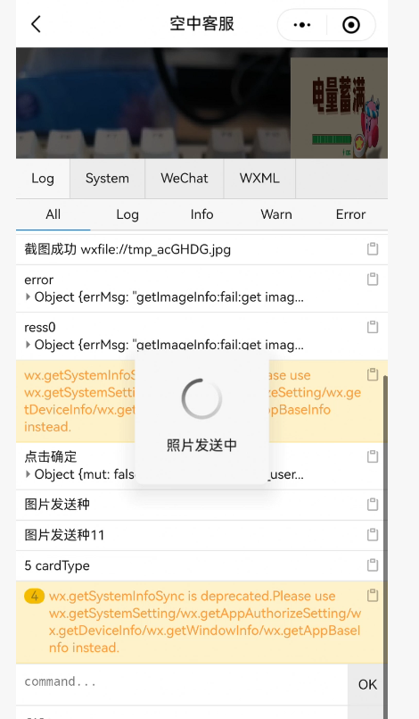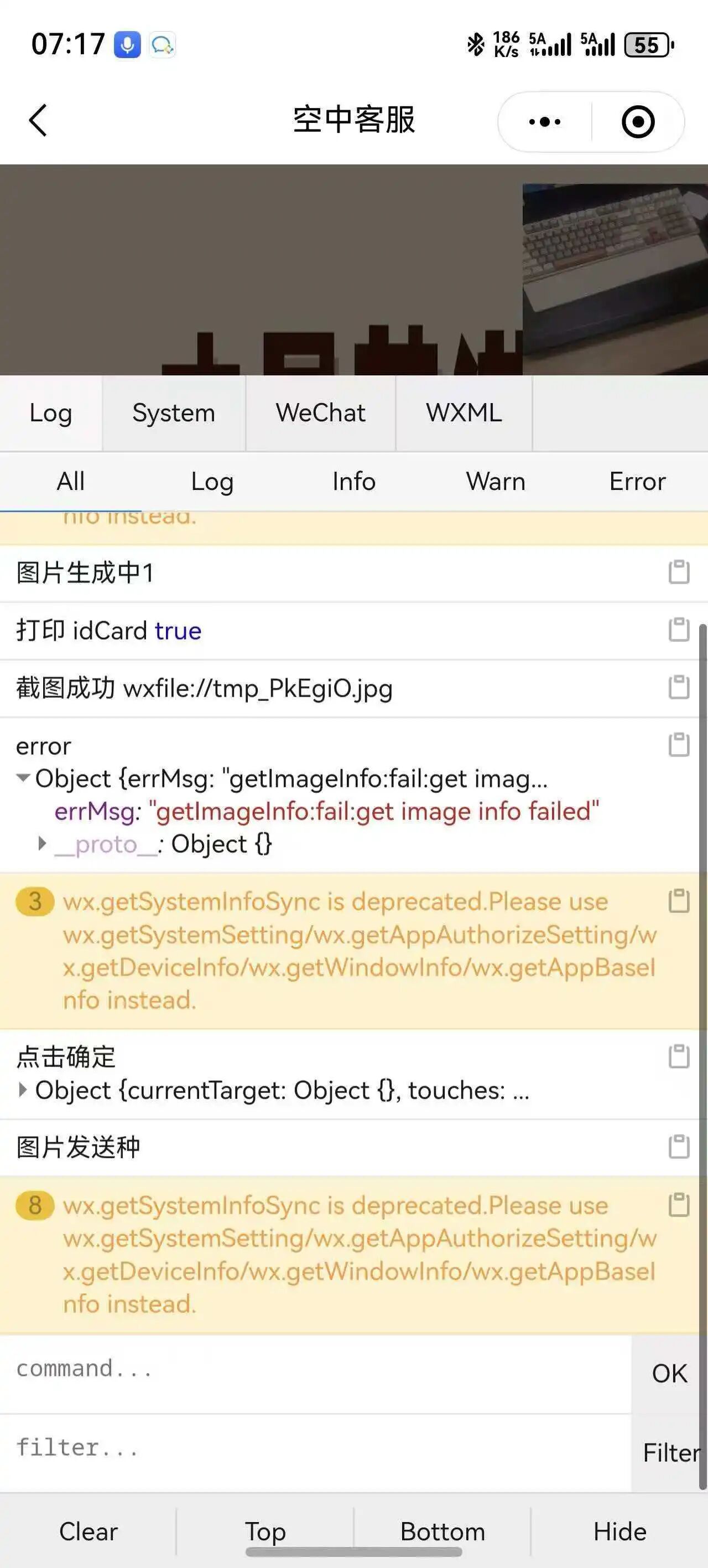// 正常手机返回 {"errno":0,"tempImagePath":"wxfile://tmp_e0a2a504360f7bd7c53c8cfc383648e37d2863918a57aa32.jpg","width":xx,"height":xx}