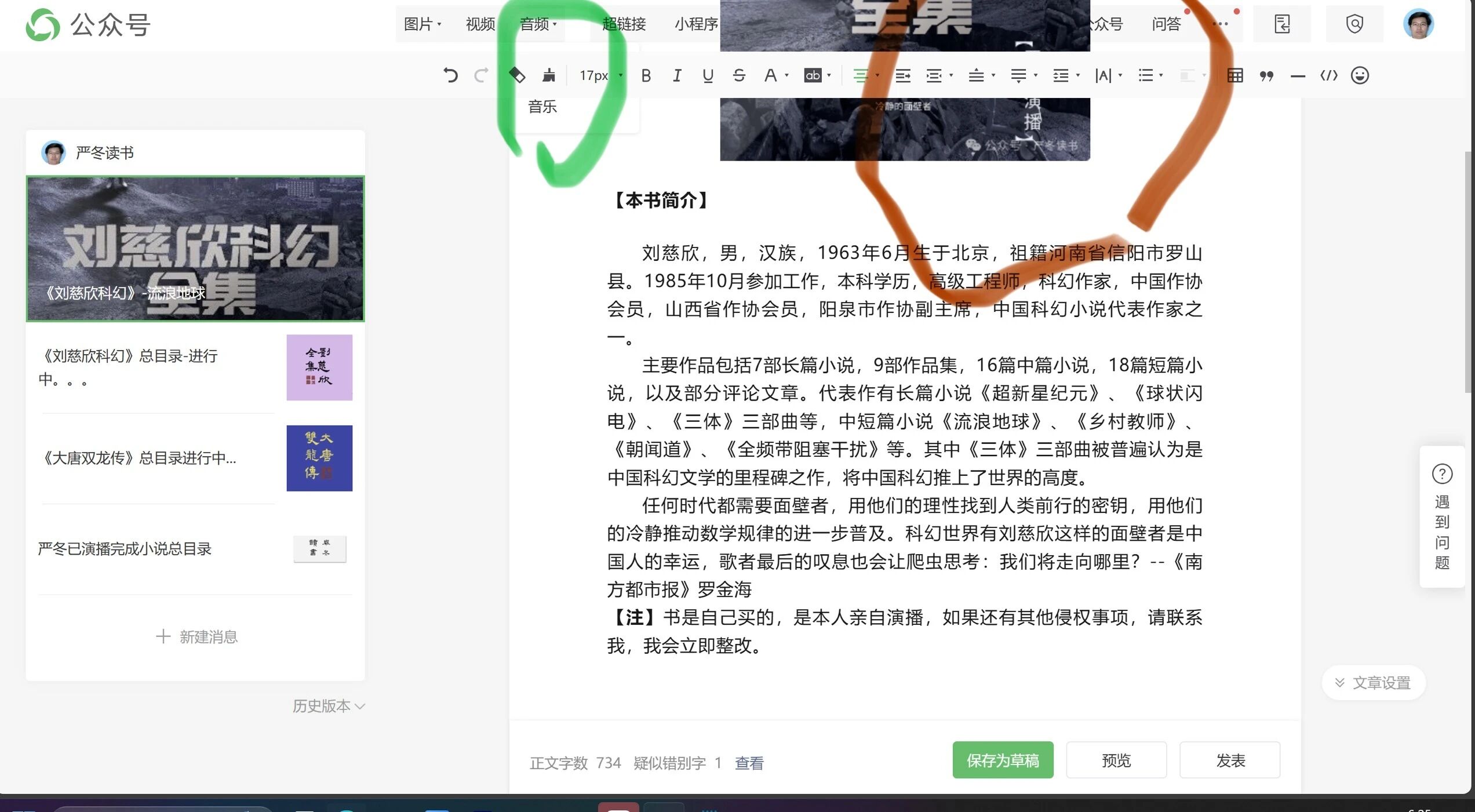 1、在文章编辑时,插入一个音频文件时,在上图的绿圈处,子菜单被工具栏压盖了,无法使用。