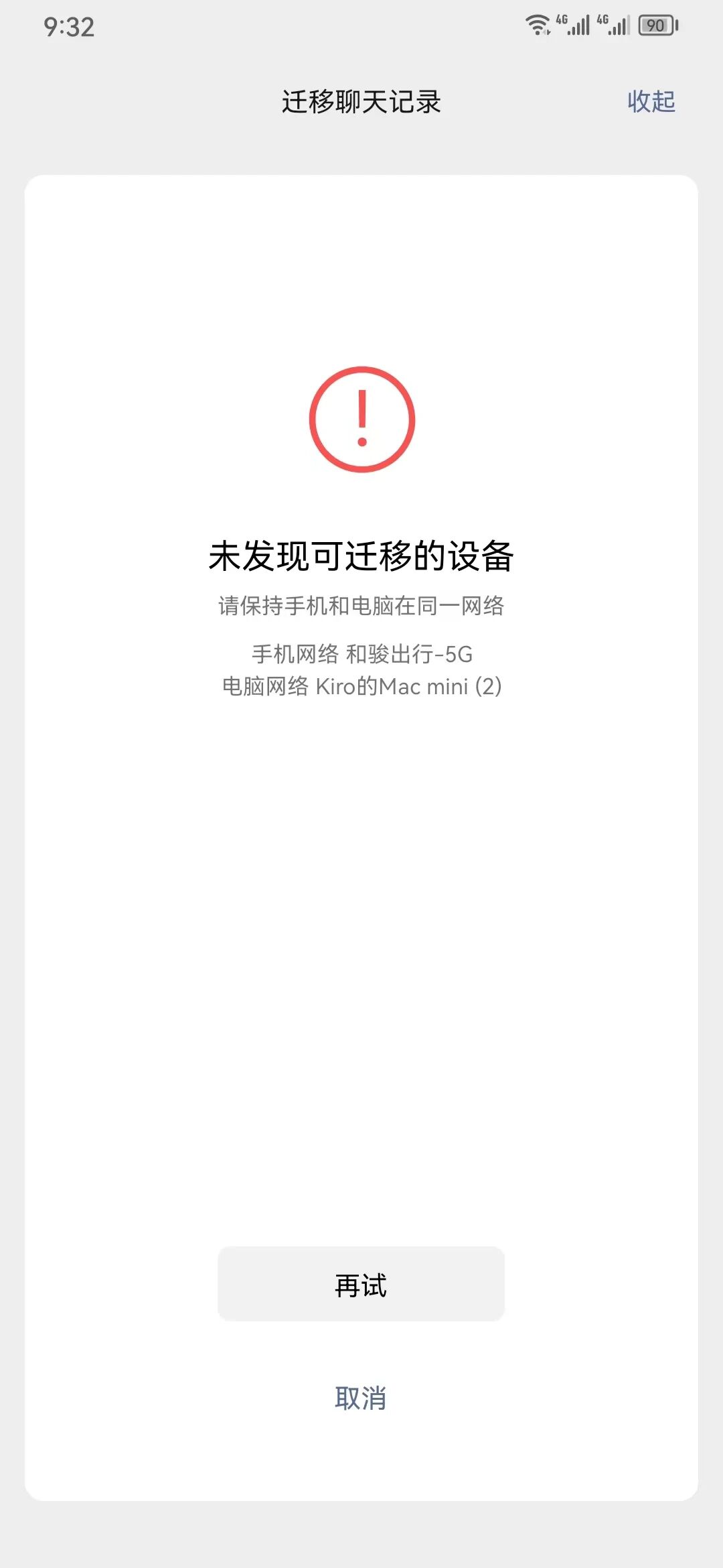 微信聊天记录迁移,提示不在同一个网络上面。
