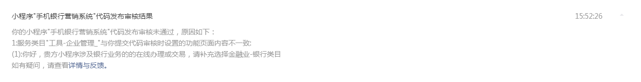 你好,经核实,1、贵方小程序名称、简介涉及敏感资质字眼:银行,需补充金融业-银行类目或者修改名称和简介;2、请提供测试信息,包含EHR号和密码