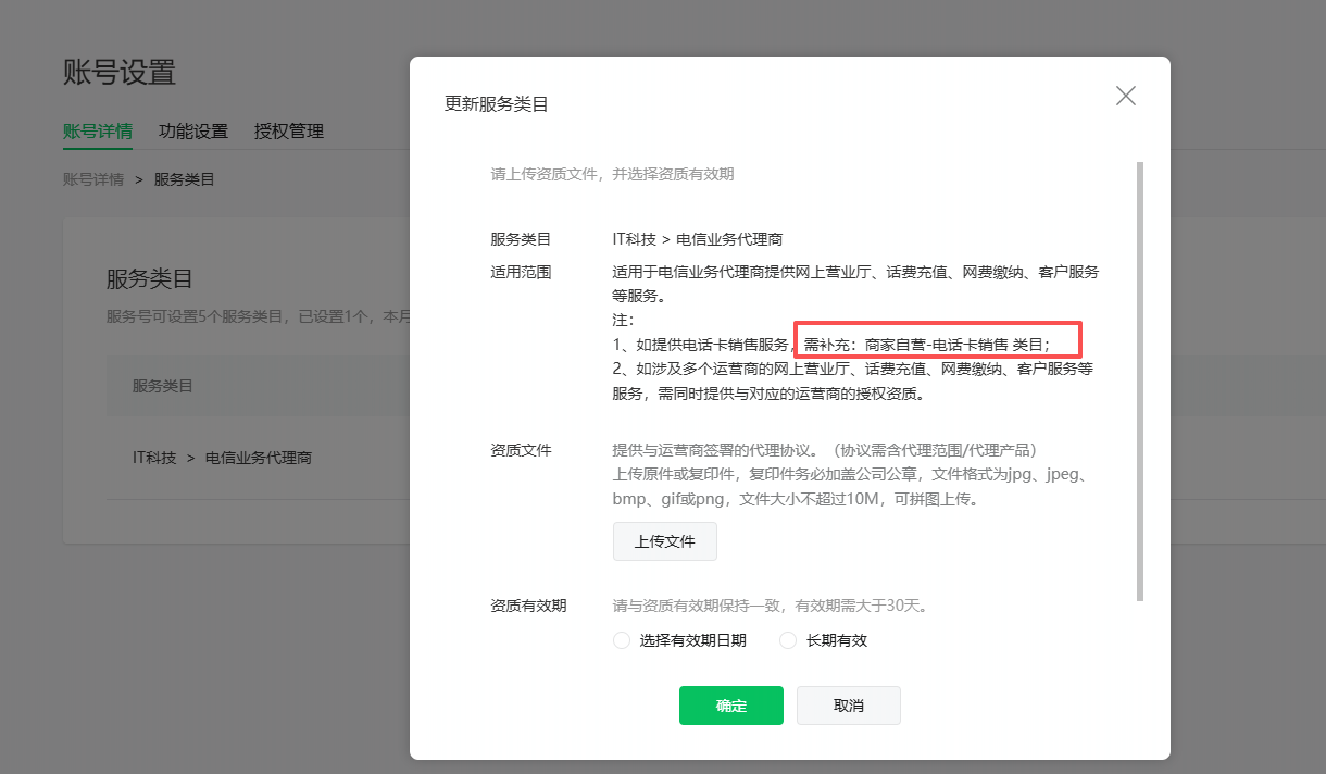 你好,服务号暂未开放【商家自营-电话卡销售】类目,该备注可忽略,若涉及电信业务代理商服务选择【it科技-电信业务代理商】类目即可。