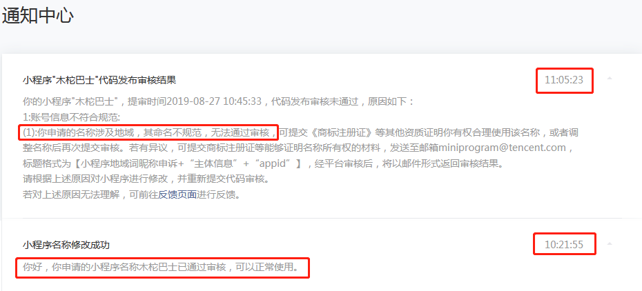 08/22,08/23,08/26发送3封邮件到<miniprogram@tencent.com>,只是问一句新名称能否通过代码审核,都没有答复。