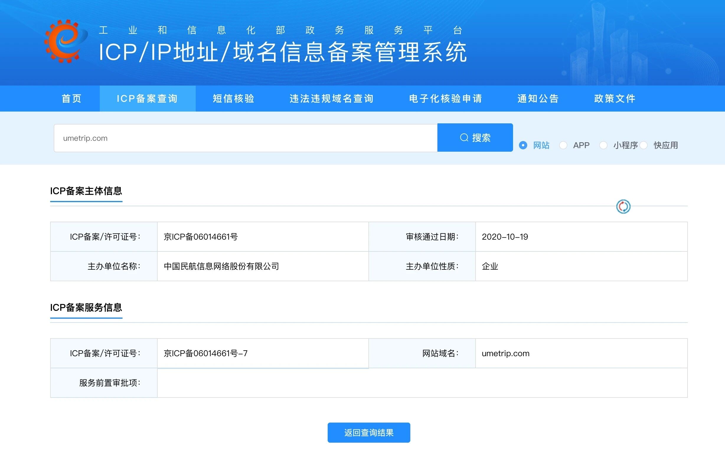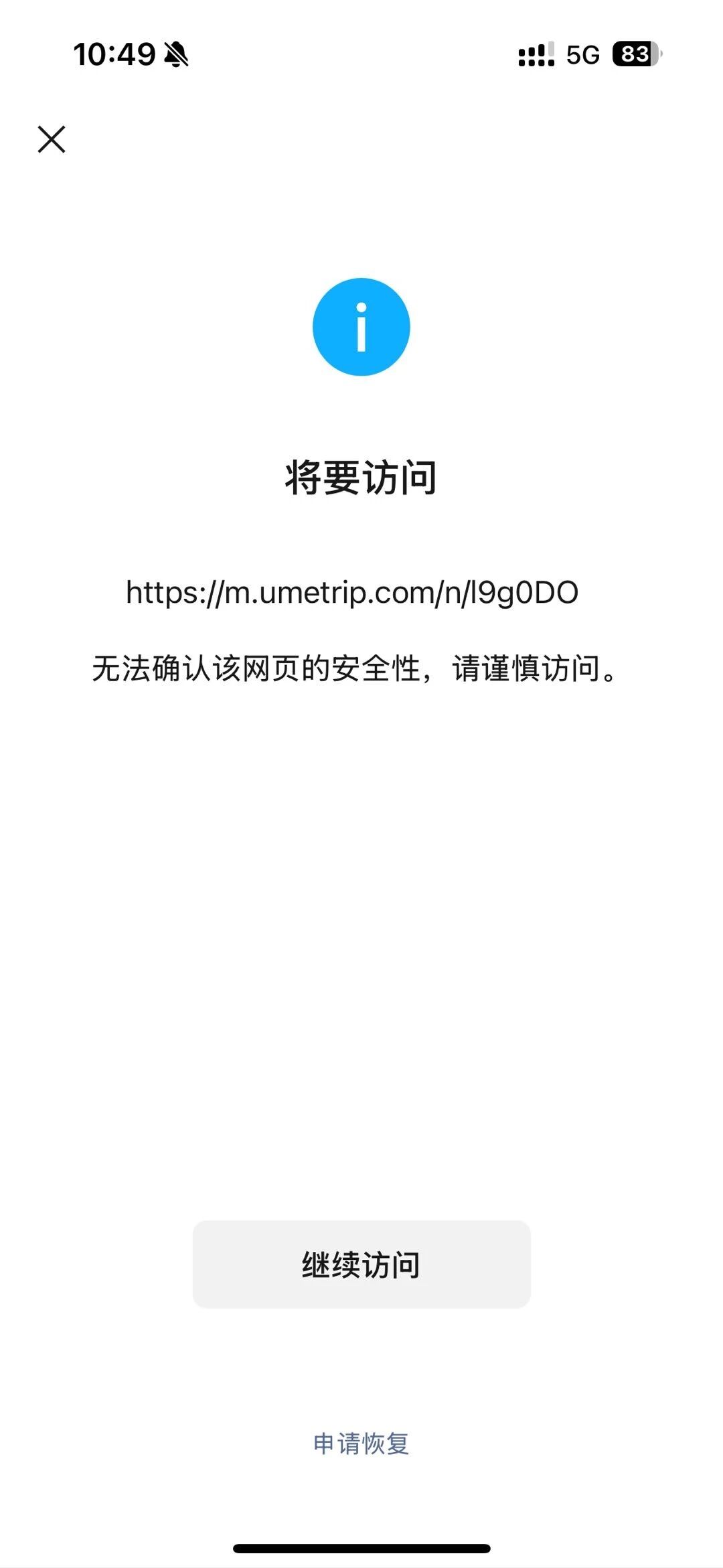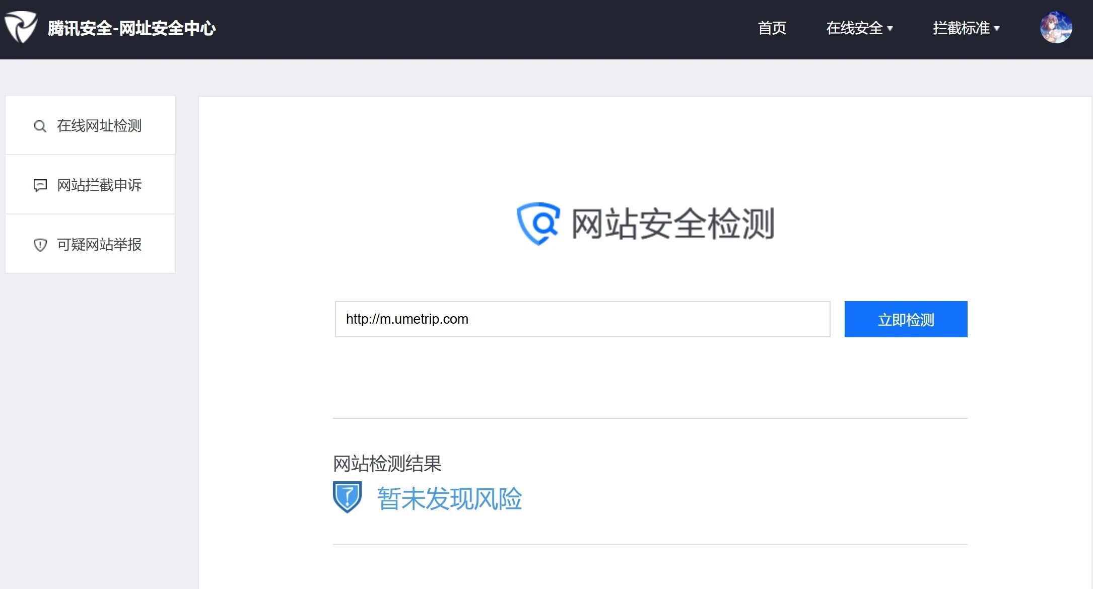 域名:umetrip.com 已通过工信部备案,备案号:京ICP备06014661号-7,域名在微信内访问时提示:“无法确认该网页的安全性,请谨慎访问。”的问题,域名经过“腾讯安全-网址安全中心”检测结果为“暂未发现风险”此域名用于App宣传下载页,网站内没有违法违规,请管理员核查后恢复域名使用权限!(域名检测结果图已放在下方)