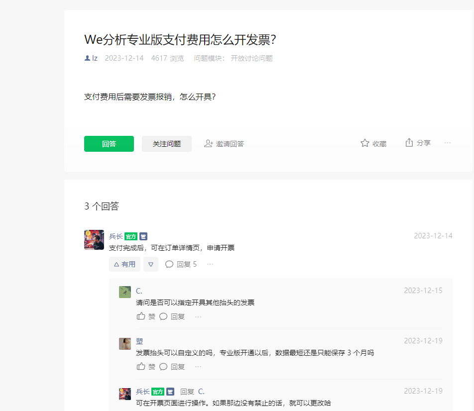 付费后可在订单详情页右上角开具发票,具体路径是【平台管理-付费管理-订单管理-查看订单】。发票抬头必须和小程序主体一致,且是主体证件号匹配到最新的抬头(不能开代付款主体抬头的发票)。