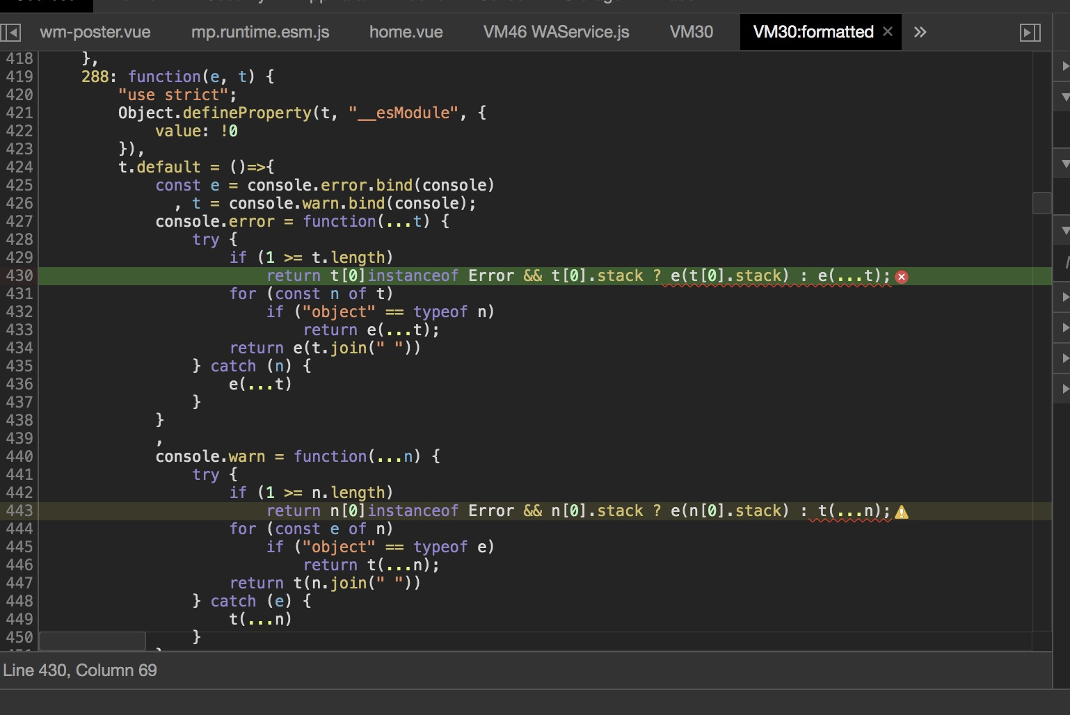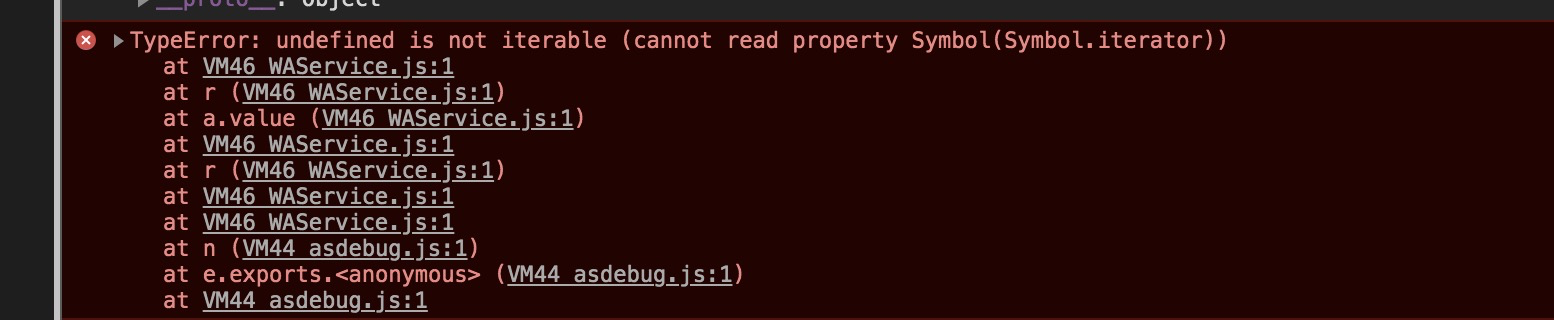 TypeError: undefined is not iterable (cannot read property Symbol(Symbol.iterator)) at VM42 WAService.js:1 at r (VM42 WAService.js:1) at a.value (VM42 WAService.js:1) at VM42 WAService.js:1 at r (VM42 WAService.js:1) at VM42 WAService.js:1 at VM42 WAService.js:1 at n (VM40 asdebug.js:1) at e.exports.<anonymous> (VM40 asdebug.js:1) at VM40 asdebug.js:1 |
