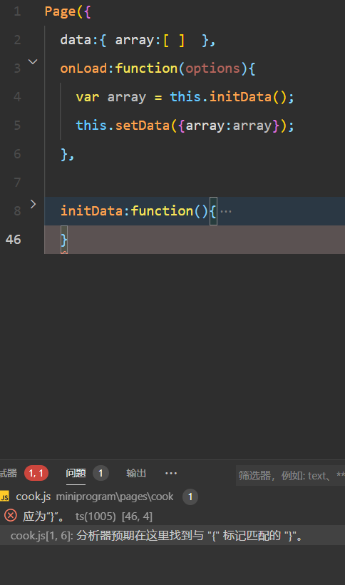 文件中少了 page 函数调用的后圆括号、参数对象的后花括号