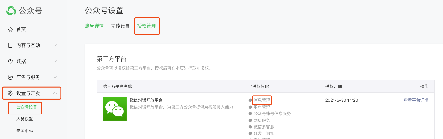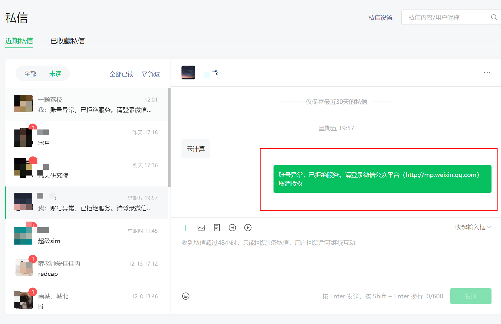 我们的公众号,授权给了第三方平台【135平台、头条号、腾讯云官网、腾讯内容开放平台、企业微信、微小助】帮助公众号运营。现在用户私信总是提示:"账号异常,拒绝服务"。查看后台,提示需要解绑第三方平台。怎么知道是哪个第三平台出了问题?