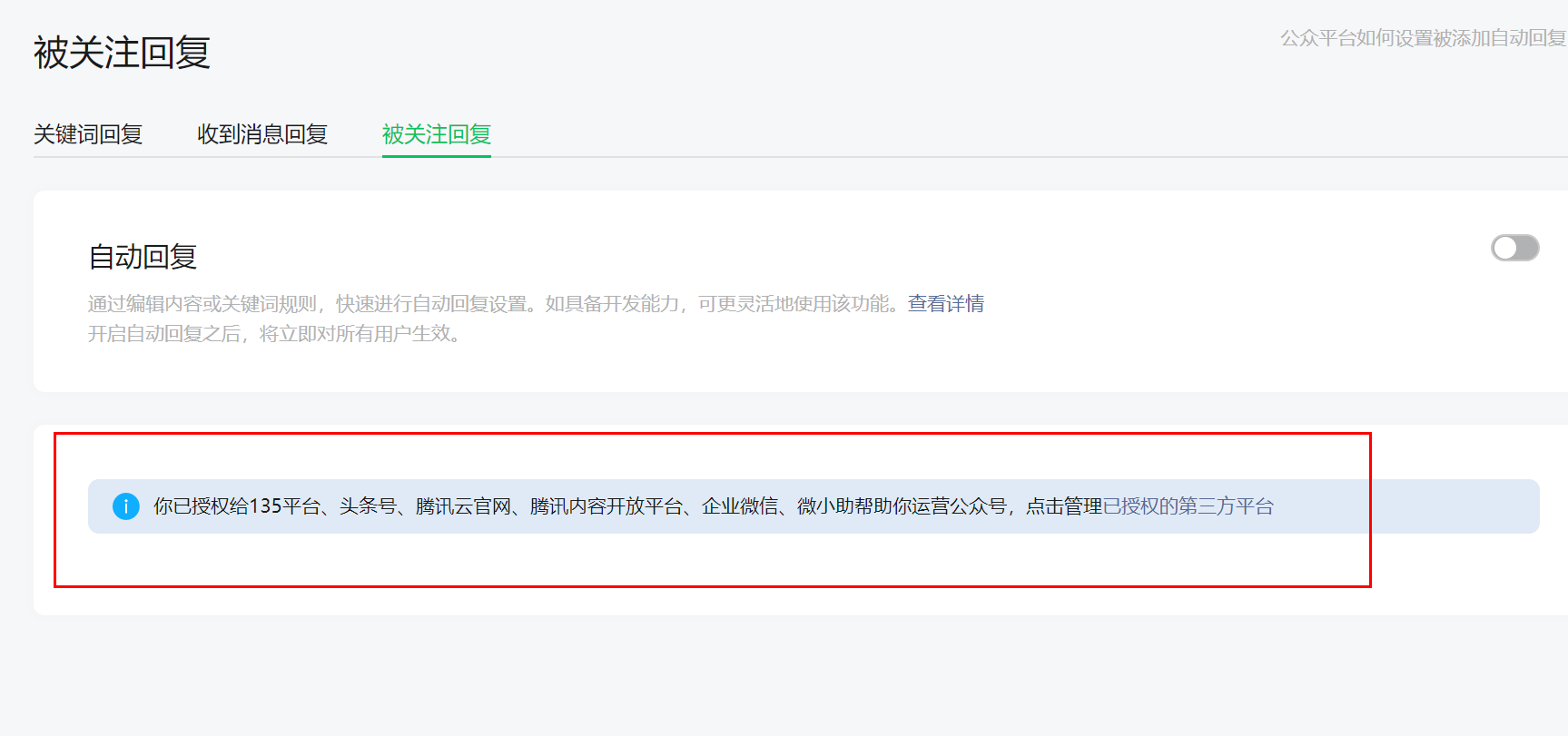 你可以到[设置与开发 -> 公众号设置 -> 授权管理]里面看下哪个第三方平台有【消息管理】权限,到第三方平台那边问下,或者如果不需要就直接解除授权,再看看还会不会有这条回复。