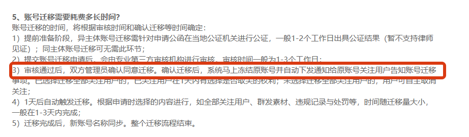 3、账号迁移审核过程中原有账号还能不能使用,不能使用那迁移需要多长时间?