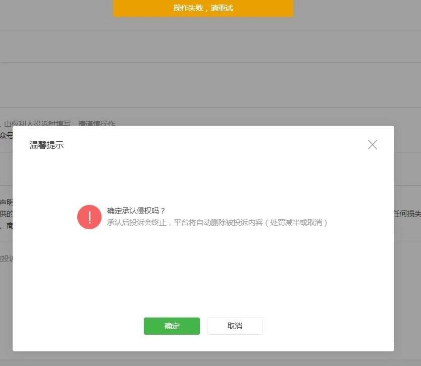 经查询,是贵方自动回复被投诉了,目前自动回复、自定义菜单不支持自首,故无论换什么浏览器会提示操作失败,建议贵方自动删除侵权播放链接,一旦发现包括不限于对贵方帐号功能进行处罚、封号等处理,请自觉遵守国家相关法律法规,不从事违法或违反《微信公众平台运营规范》及相关规则的内容和行为。