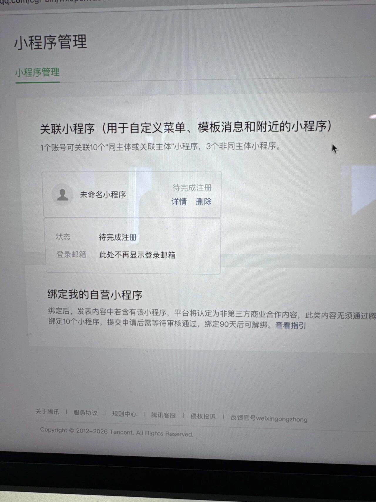 小程序认证邮件点开显示注册失败,此帐号已激活,使用帐号密码登陆。公众号后台点进小程序管理,显示呆完成注册。如何继续完成注册?