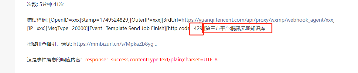错误样例: [OpenID=xxx[Stamp=1749524829][OuterIP=xxx][3rdUrl=https://yuanqi.tencent.com/api/proxy/wxmp/webhook_agent/xxx][IP=xxx][MsgType=20000][Event=Template Send Job Finish][http code=429][第三方平台:腾讯元器知识库