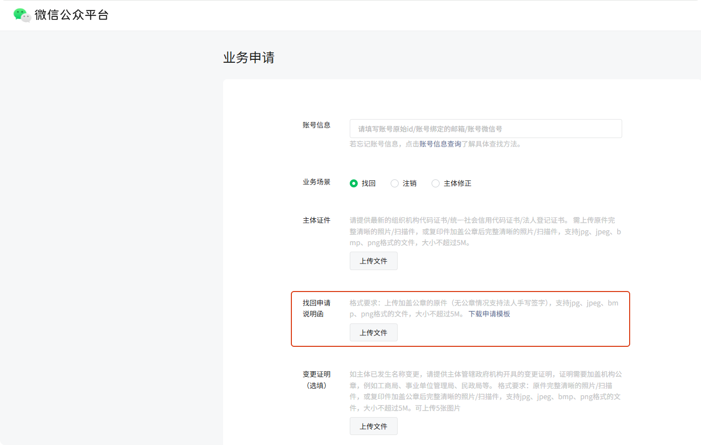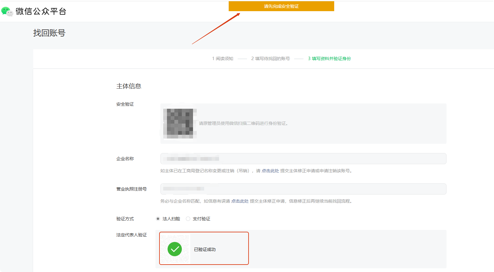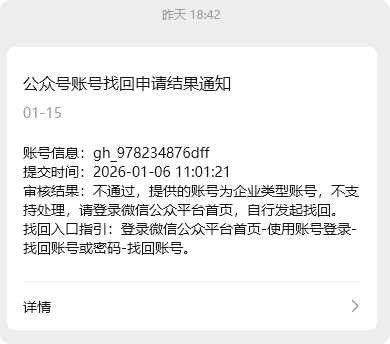 如题,企业公众号找不到原管理员了,走了业务申请里的找回(https://mp.weixin.qq.com/webpoc/accountBack?token=&lang=zh_CN),上传了营业执照和找回申请说明函,但申请不通过,说不支持企业类型账号处理,让自行发起找回(https://mp.weixin.qq.com/acct/findacct?action=scan&token=&lang=zh_CN),但自行发起找回需要原管理员进行扫码安全验证,死循环了,请帮忙处理下,谢谢!